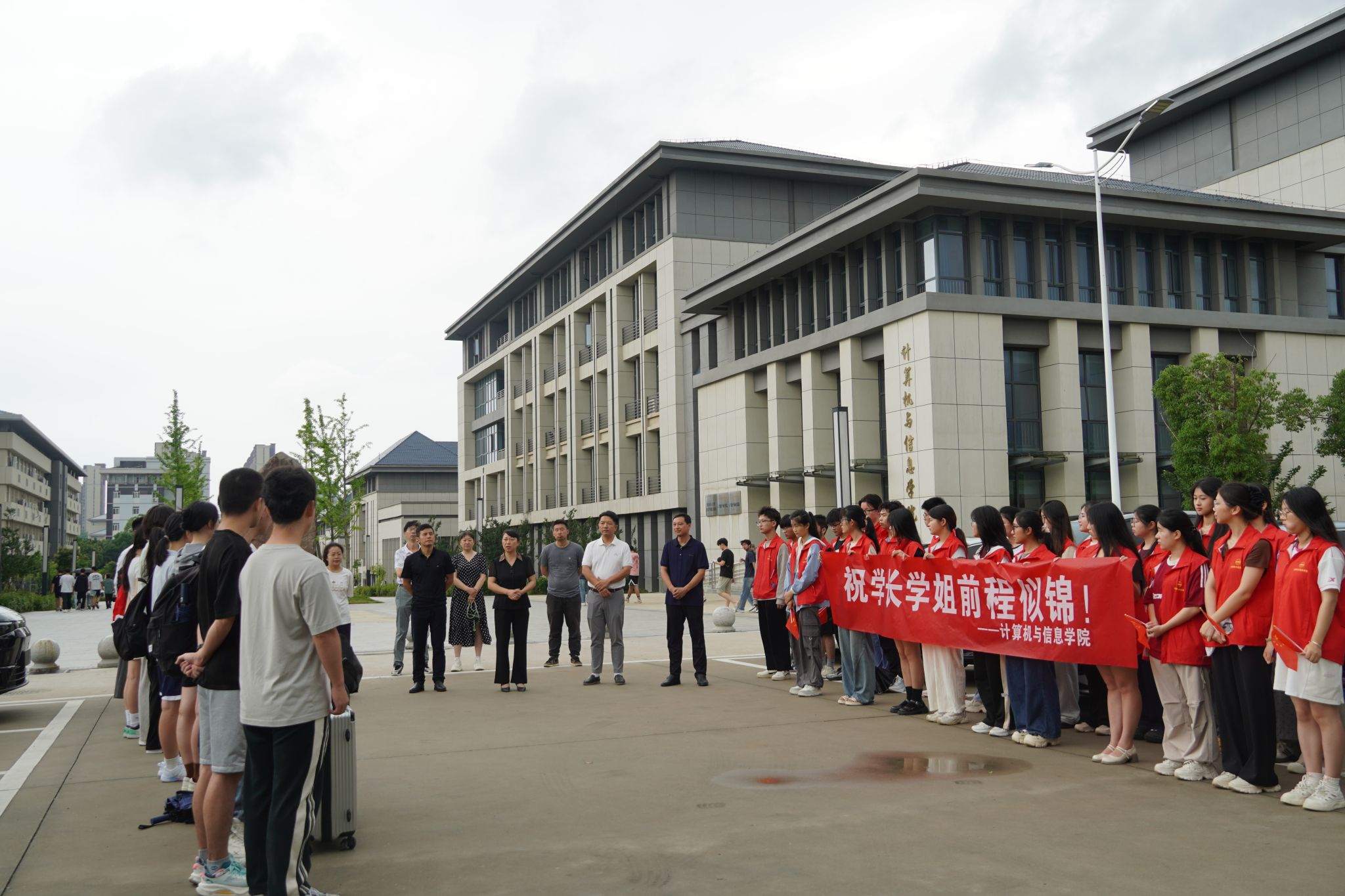 活动现场,由学院领导班子成员、全国样板党支部党员教师、安徽省样板党支部党员教师等组成的爱心车队已整装待发。学院党委书记陈银凤在临别致辞中饱含深情:“愿你们在时光的长河中,用智慧与勇气编写精彩的代码,用坚持与信念调试完美的程序,用责任与担当运行高尚的灵魂。在数字的星辰大海中,找到属于自己的坐标,绽放独一无二的光芒。”学院院长王远志则为毕业生逐一赠送印有学院大楼剪影的纪念明信片,方寸卡片间承载着厚重的师生情谊。