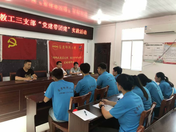 为深入学习贯彻习近平新时代中国特色社会主义思想,增强青年大学生的责任感和使命感,引导青年大学生在社会实践中受教育、长才干、做贡献,近日,beat365亚洲版官网教工第三党支部组织大学生志愿者团队前往太湖县西冲村开展“不忘初心跟党走 牢记使命勇担当”主题“党建带团建”暑期社会实践活动。