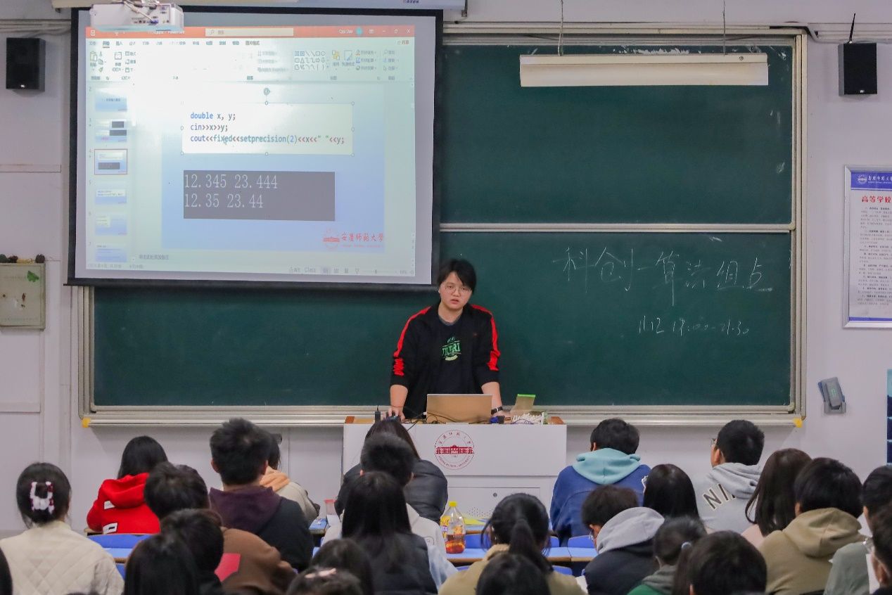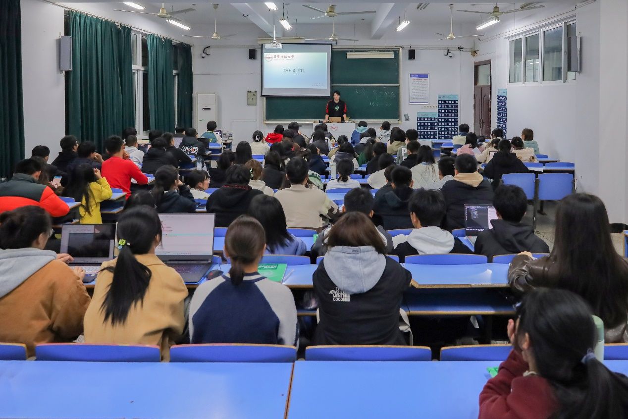 11月12日,beat365亚洲版官网于C楼105教室,开展计算机编程实操课程培训。“只需要一行代码,就可以少写几十个头文件……”课上,授课学生、计算机科学与技术(工)2021级(2)班的乔添歌正在向学生们介绍程序设计竞赛中的技巧。
