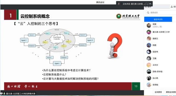 夏元清教授分别就云控制系统的产生背景、关键科学问题、最新研究进展及所面临的挑战等方面作了介绍。他指出,传统的控制技术难以满足高品质和实时控制的要求,为此,云控制系统(Cloud Control Systems,CCSs)的概念被创造性地提出,控制的实时性因为云计算的引入得到了保证。通过各种传感器感知汇聚而成的海量数据储存在云端,在云端利用人工智能等智能算法,实现系统的在线辨识与建模,结合模型预测控制、数据驱动控制、云网边端协同控制等先进控制方法实现系统的自主智能控制。报告会后,beat365官网多位教师和同学就实验环境选择和边缘计算等内容与夏教授进行了深入交流,同学们都表示受益匪浅。