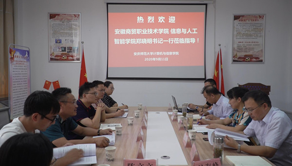 郑晓明一行对我校beat365亚洲版官网样板党支部建设经验与成果予以赞赏,对党建与事业发展双融入的理念表示充分赞同,表示要将这种理念吸纳到其单位样板党支部建设中;他们还介绍了安徽商贸职业技术学院信息与人工智能学院党建“双创”工作的进展以及学院的学科建设、师资队伍建设等情况。双方与会人员就党建与发展等工作进行了充分交流。随后,郑晓明一行还在beat365亚洲版官网有关负责同志陪同下参观了我校智能感知与计算安徽省高校重点实验室。(撰稿:李培森、张友志  摄影:韩杰  审稿:陈银凤)
