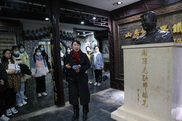 陈银凤从稼先班的创办初衷和新时代师范教育类大学生的成长责任两个角度引导学生们思考我们是谁和《思想道德修养与法律基础》是怎样一门课之后,带领大家来到邓稼先故居——铁砚山房,开展了以“传承稼先精神,争做时代新人”为主题的第一讲。陈银凤现场介绍了故居的历史和作为爱国教育基地的育人功能,她用“9”、“0”、“28”等系列数字满怀深情地讲述了“两弹一星元勋”邓稼先立志报国、以身许国、用生命铸就大国利器的感人事迹,通过邓稼先的成长经历让同学们进一步了解中华民族那段不堪回首的屈辱岁月,分析了当时历史条件下国家遇到的困难与挑战、民族面临的风险与考验,讲述了以邓稼先为代表的科学家们用实际行动攻坚克难科学报国,无私奉献忠实于党、开拓创新勇攀高峰的豪迈气概,阐释了邓稼先精神所蕴含的丰富内涵。