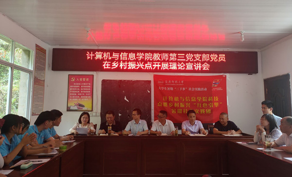 为切实发挥高校政治和组织优势,引导基层广大党员干部深入学习党的百年历史,营造“学党史、悟思想、办实事、开新局”的浓厚氛围,7月12日,学院教师第三党支部党员江晋剑、陈文文等前往学校乡村振兴帮扶点开展党史理论宣讲活动,支部党员陈文文作了题为《近代中华民族的历史任务和辛亥革命》的党史理论宣讲,学校乡村振兴帮扶点西冲村党支部书记朱先如、村两委成员、党员群众代表及暑期社会实践大学生参加了宣讲会,会议由江晋剑主持。