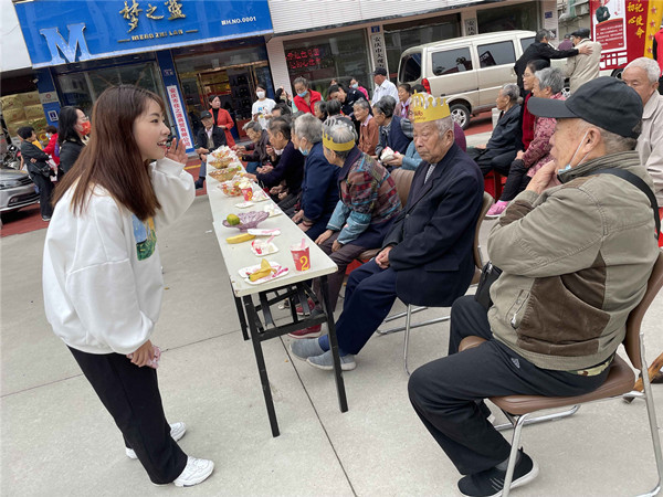 “爷爷奶奶,祝你们生日快乐!”志愿者们了解到重阳节这天是敬老院里4位老人的生日后,纷纷为其送上生日蛋糕和祝福,来自黄梅剧艺术学院的学生表演了《剑舞》、《打猪草》等节目。 “因为是献给老人的歌曲,所以选了这首充满童年趣味的曲目,让老人想起童年时的快乐。”在丁诗雯看来,能够让老人们感受到幸福是一件很有意义的事情。