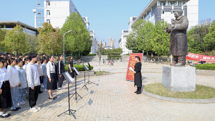 在稼先广场,该班40名学生面对邓稼先雕像深深鞠躬,在场的三名学生代表朝向雕像缓步献上三朵白色雏菊,以表达对逝者的深切怀念与尊敬之情。“在这充满情感的日子,我们身为‘稼先青年’,又该以怎样的方式传承精神寄托我们的哀思?”陈银凤引导在场学生思考中国青年的时代定位、明确中国青年的时代担当与责任,回顾了邓稼先立志报国、以身许国的生命历程,学生们凝视着雕像,认真聆听,思考……