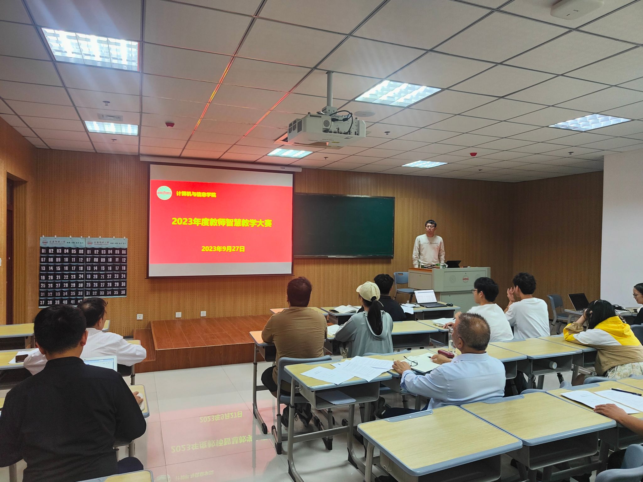 2023年9月27日下午,beat365官网在龙山校区L102举行了2023年度教师智慧教学大赛。本次大赛由副院长吴海峰主持,邀请钱萌、王一宾、江克勤、蔡庆华等四位专家担任评委,多位学生旁听。