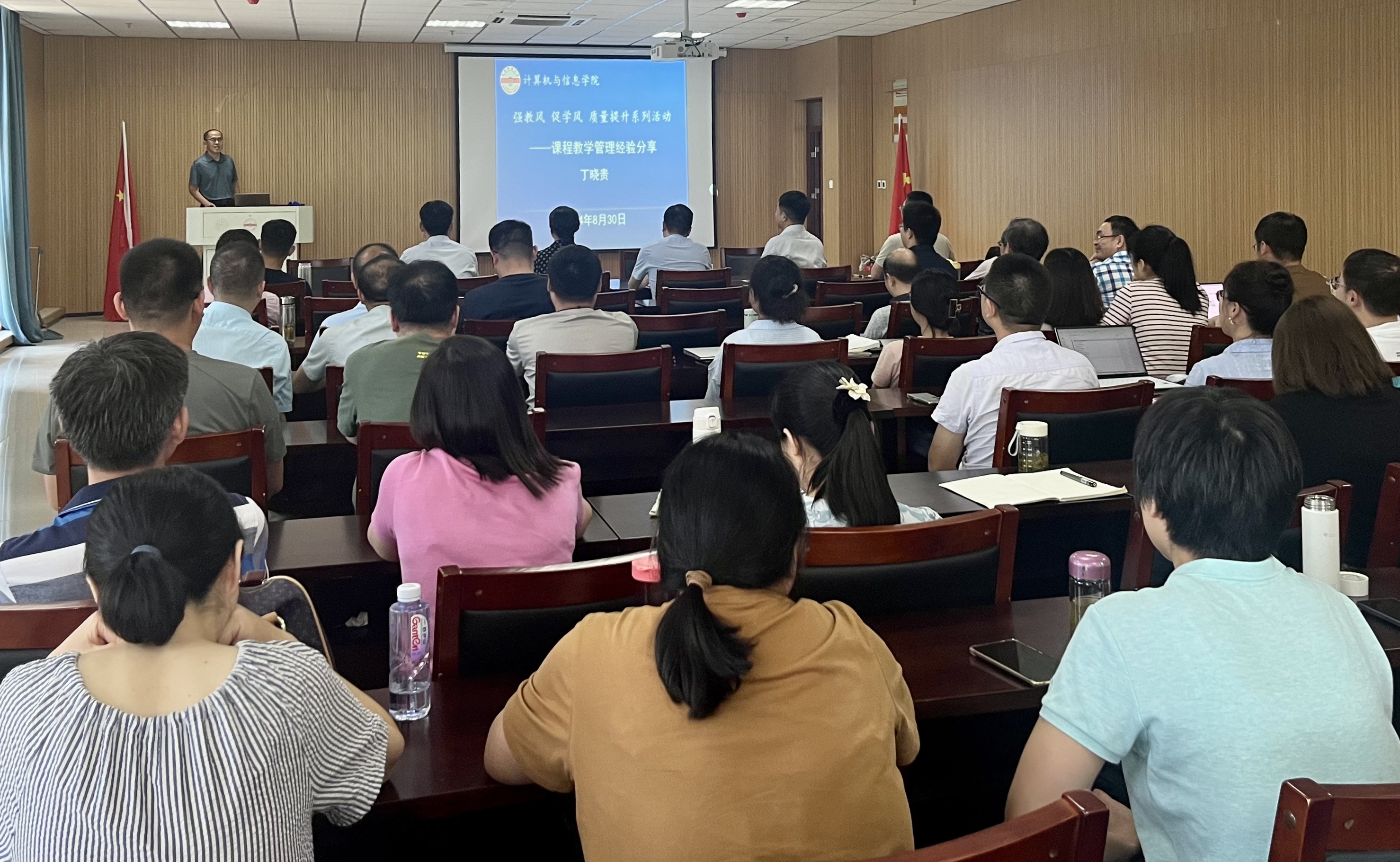 为积极响应《中共中央国务院关于弘扬教育家精神加强新时代高素质专业化教师队伍建设的意见》的号召,8月30日下午,beat365亚洲版官网在L318成功举办“强教风 促学风”质量提升系列活动的首场讲座。本次讲座特别邀请教学经验丰富的丁晓贵老师,深入分享他在课堂管理方面的宝贵经验和独到见解。