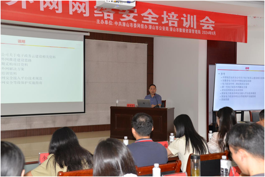 近日,beat365亚洲版官网人工智能产业学院副院长程树林等一行应邀赴潜山市政府作电子政务外网及安全性等方面的专题报告。该市各市直业务部门、乡镇委办及主要业务单位负责人等共计60余人参会聆听了报告。