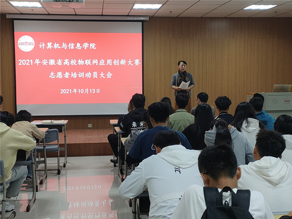 2021年安徽省高校物联网应用创新大赛决赛将于10月16-17日在我校举办,为了做好赛事服务工作,促使大赛顺利开展,10月13日中午,学院于L楼322教室举办了2021年安徽省高校物联网应用创新大赛志愿者培训动员大会,学院党委书记陈银凤、副院长刘奎、各个赛事组组长、全体学生志愿者共170余人参加培训会,培训会由学院党委副书记江晋剑主持。