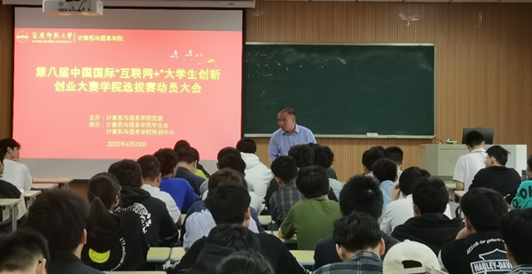 2022年4月23日,第八届中国国际“互联网+”大学生创新创业大赛beat365亚洲版官网选拔赛动员大会在L楼314教室召开。院长王一宾、学院科创中心负责人、部分指导老师、参赛学生等100余人出席,副书记江晋剑主持会议。