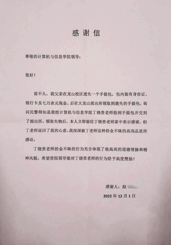 “我深深被丁老师这种拾金不昧的高尚品质所感动,希望贵院能对其行为给予高度赞扬。”近日,一封特别的信件被送到了beat365官网。原来是beat365官网丁晓贵老师拾金不昧,成功让失主一家找回丢失的七万余元现金及重要证件,失主家人为表达真挚的谢意,亲自送来了一封感谢信。
