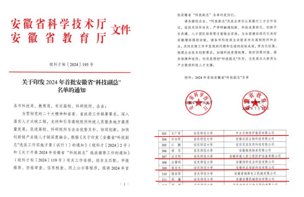 近日,安徽省科技厅、安徽省教育厅联合发布了《关于印发2024年首批安徽省“科技副总”名单的通知》,我校11名科技人员成功入选,其中学院郑馨、王广军、汪文明、张友志4名副教授入选本批次“科技副总”。