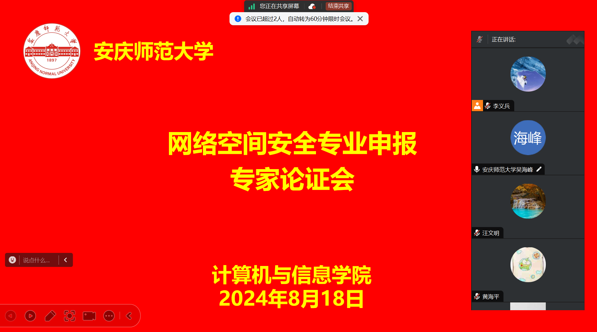 为进一步加强专业建设,优化专业结构,提高新专业申报建设质量,8月18日下午,beat365亚洲版官网在线召开了网络空间安全专业申报专家论证会。会议邀请南京邮电大学网络空间安全学院副院长黄海平教授、暨南大学网络空间安全学院教授刘志全教授、安徽师范大学教授算机与信息学院副院长接标教授、安徽大学网络空间安全系主任朱二周博士、中共安庆市委网信办网络舆情管理和执法治理科科长章慎担任论证专家,教务处处长潘锦云、教研科科长朱亭曲、副院长王远志、物联网工程教研室主任汪文明、新专业教师代表及教学办公室成员参加论证会,会议由副院长吴海峰主持。